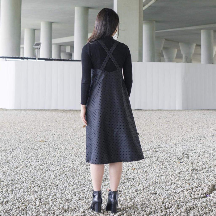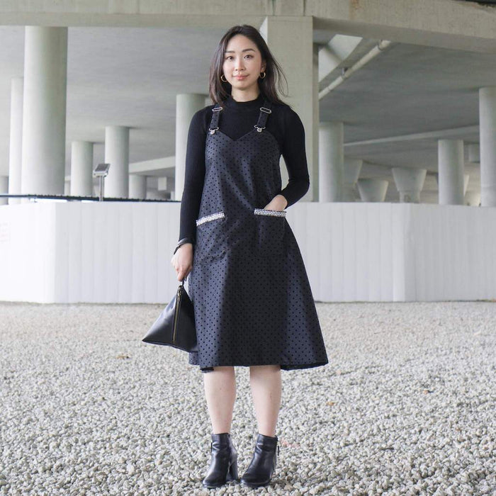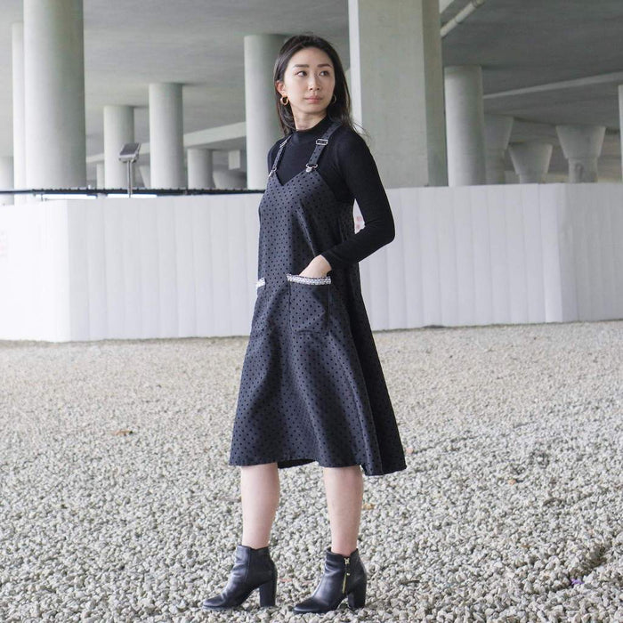 Layer this roomy dress over a fitted top and pair it with heels or sneakers for a preppy look! This pinafore dress features buckles on the straps for easy adjustment or removal. It has an angular sweetheart neckline with a comfy tent silhouette and patch pockets.